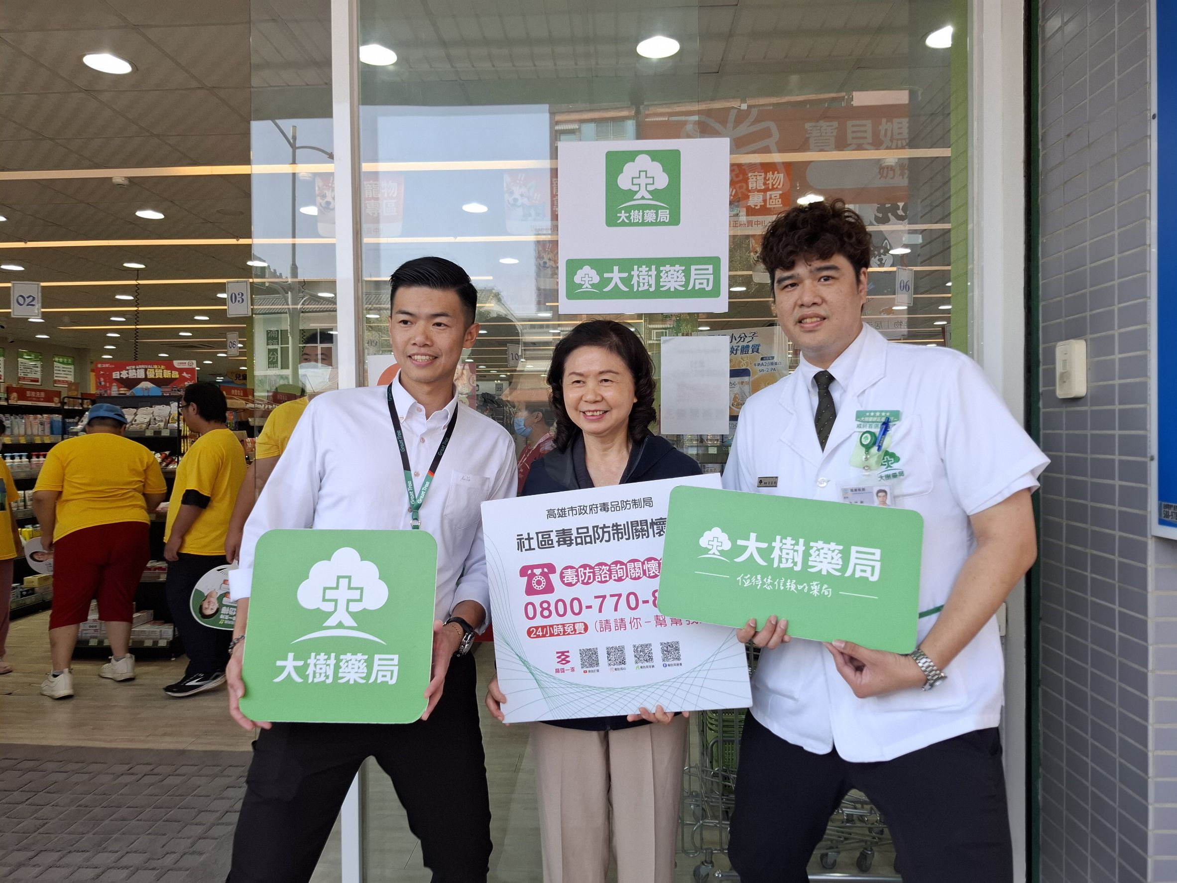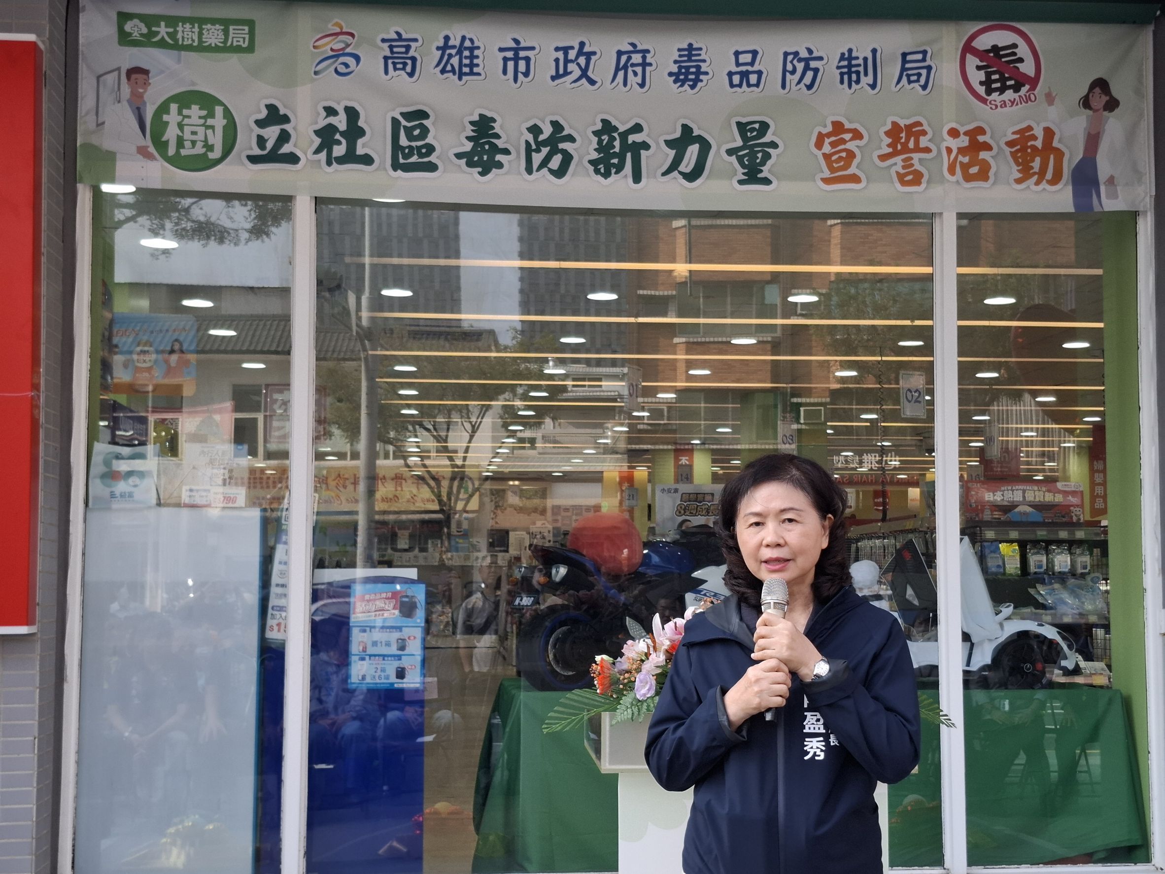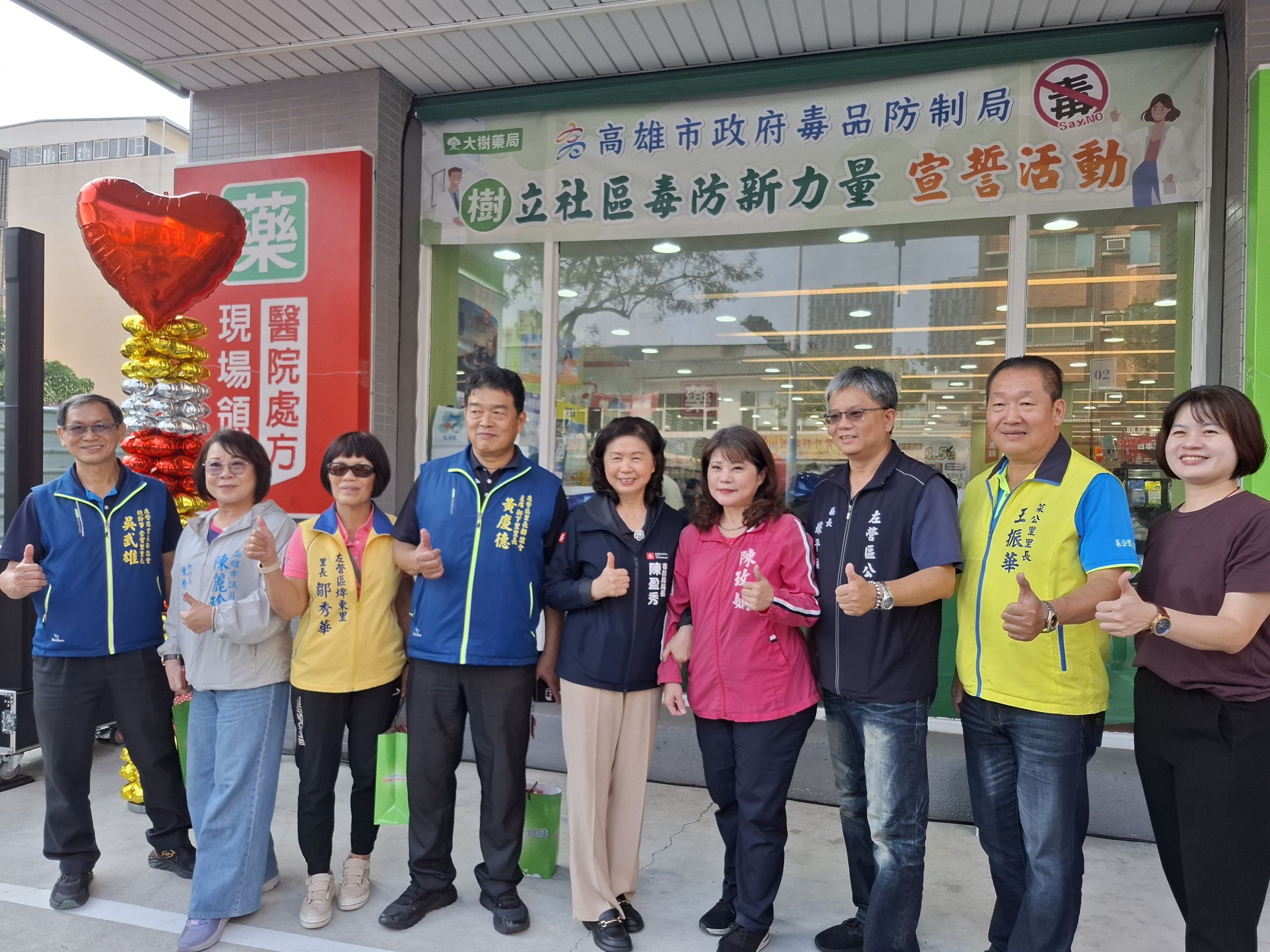 高雄市毒品防制局攜手大樹藥局、高雄市藥師公會及高雄市第一藥師公會,於11月17日在大樹連鎖藥局左營華夏店舉辦「『樹』立社區毒防新力量」宣誓活動。陳盈秀局長與大樹藥局高雄營業本部長陳俊凱藥師、藥師公會杜仿裕理事長、羅旭峯常務理事、林武松監事、高雄市第一藥師公會江慶豐常務理事,以及陳玫娟議員、林岱樺立委代表、陳麗珍、李眉蓁、白喬茵議員代表、左營區蘇平福區長、黃慶德里長主席與5位里長共同宣誓,展現醫藥界與社區攜手投入毒品防制的決心,也彰顯公私協力共同守護市民健康的力量。