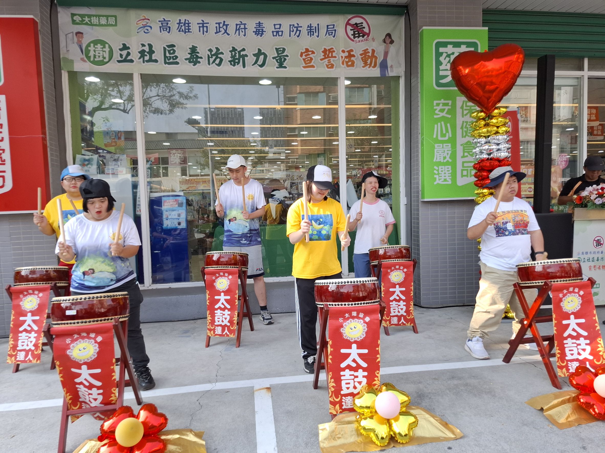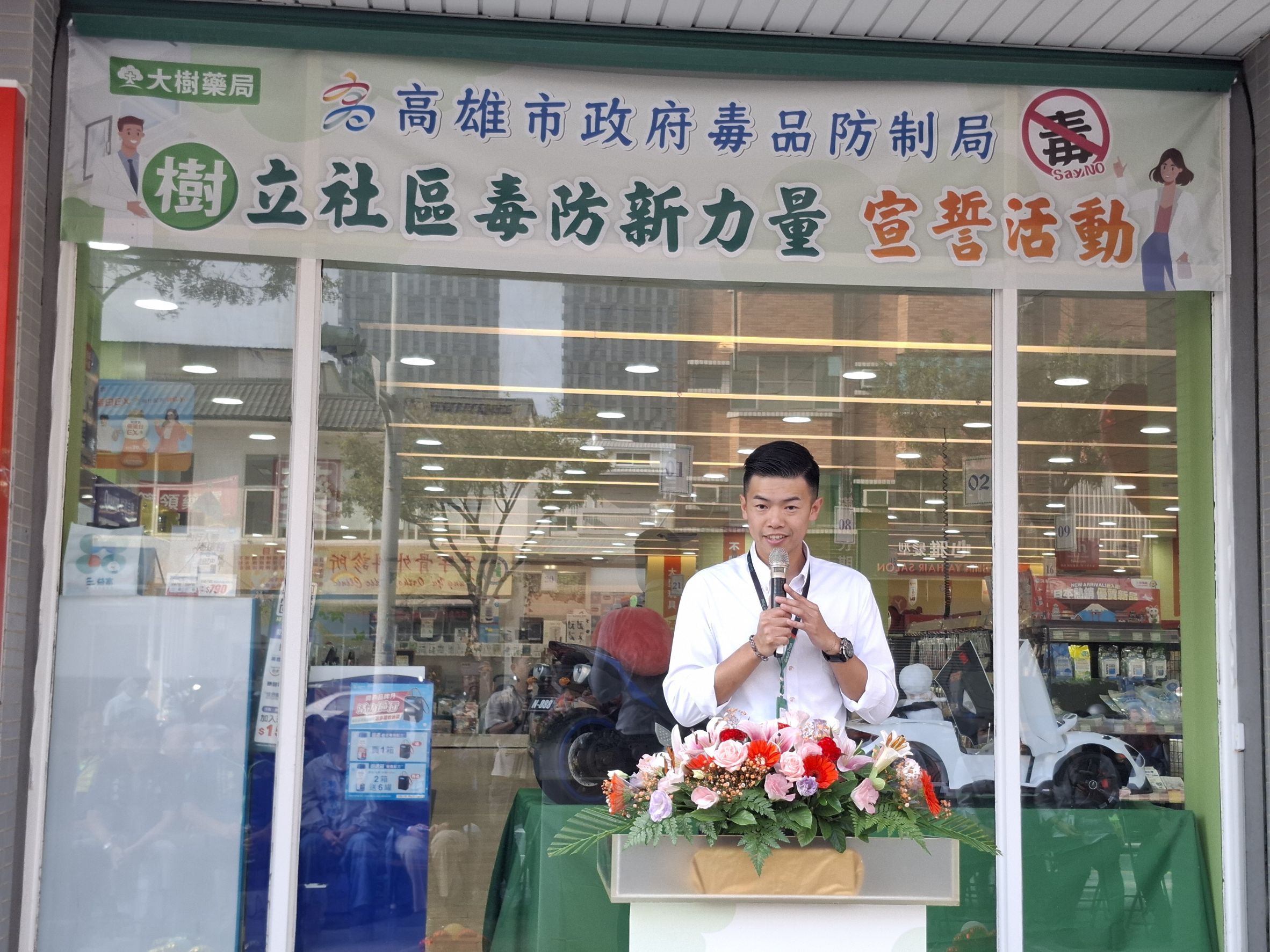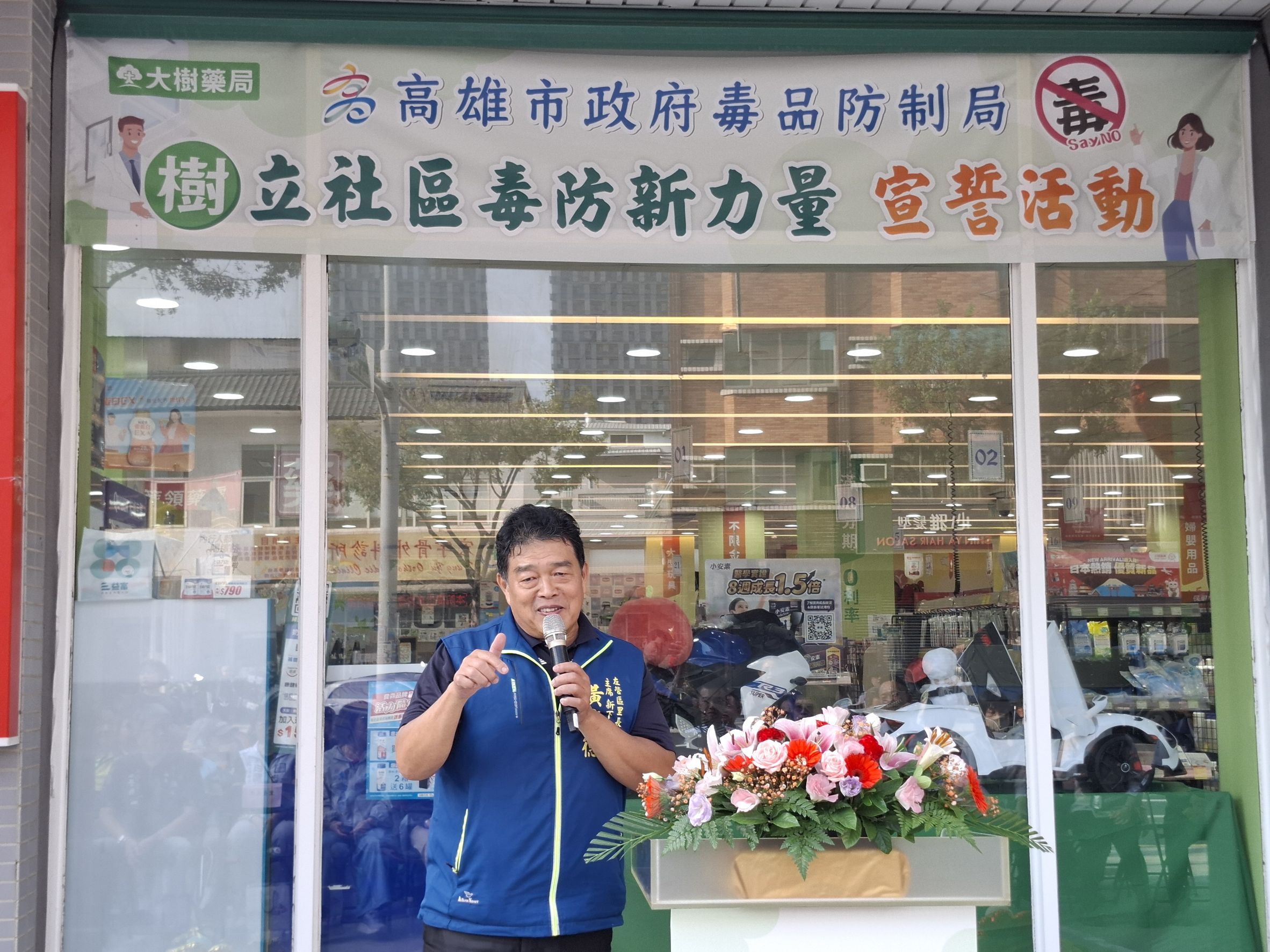 高雄市毒品防制局攜手大樹藥局、高雄市藥師公會及高雄市第一藥師公會,於11月17日在大樹連鎖藥局左營華夏店舉辦「『樹』立社區毒防新力量」宣誓活動。陳盈秀局長與大樹藥局高雄營業本部長陳俊凱藥師、藥師公會杜仿裕理事長、羅旭峯常務理事、林武松監事、高雄市第一藥師公會江慶豐常務理事,以及陳玫娟議員、林岱樺立委代表、陳麗珍、李眉蓁、白喬茵議員代表、左營區蘇平福區長、黃慶德里長主席與5位里長共同宣誓,展現醫藥界與社區攜手投入毒品防制的決心,也彰顯公私協力共同守護市民健康的力量。