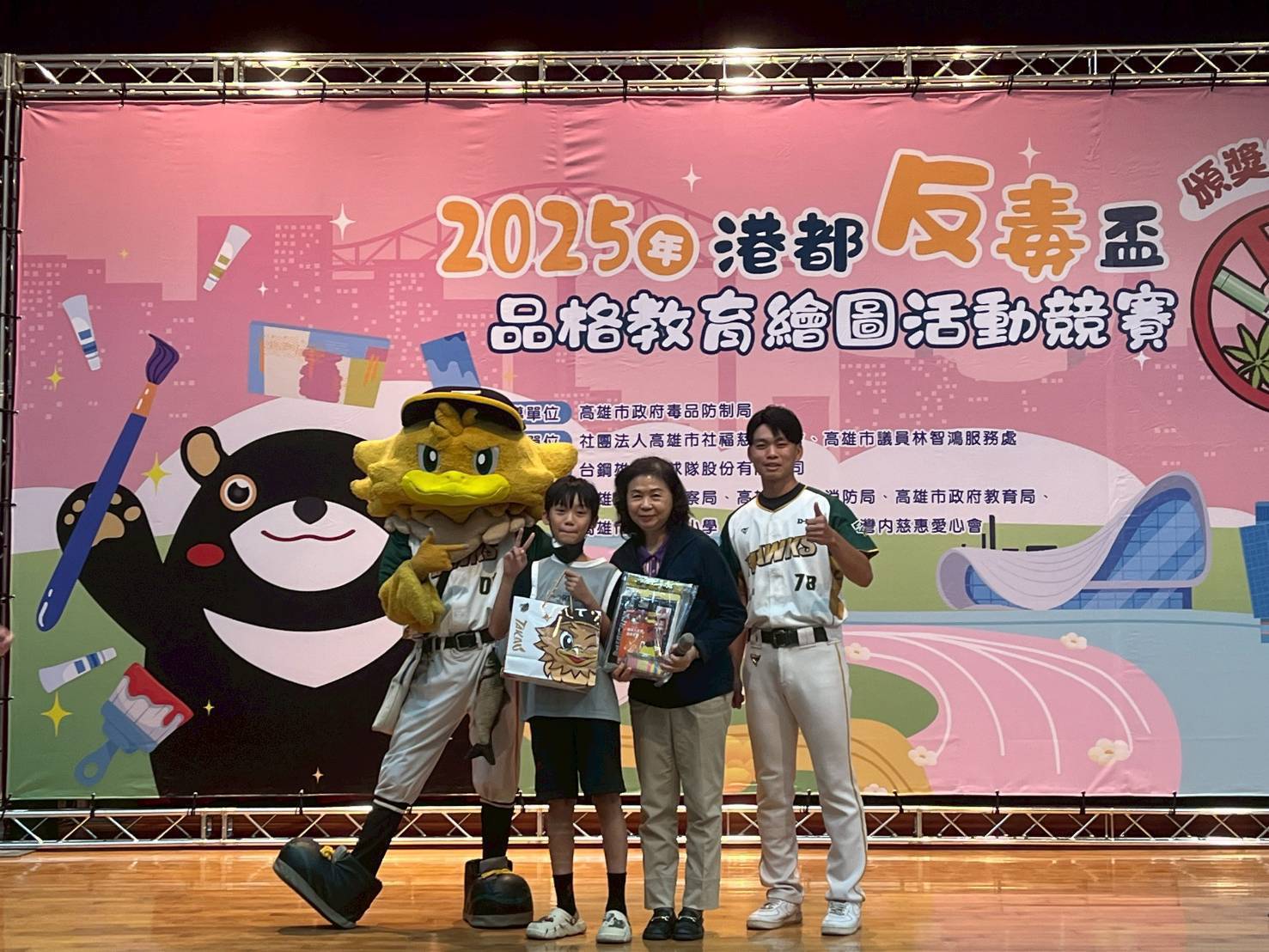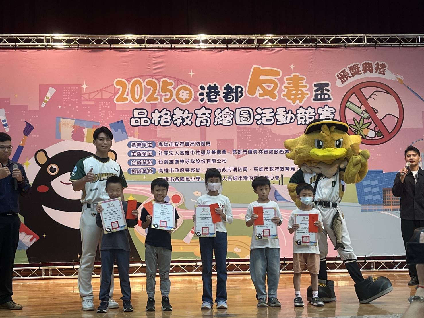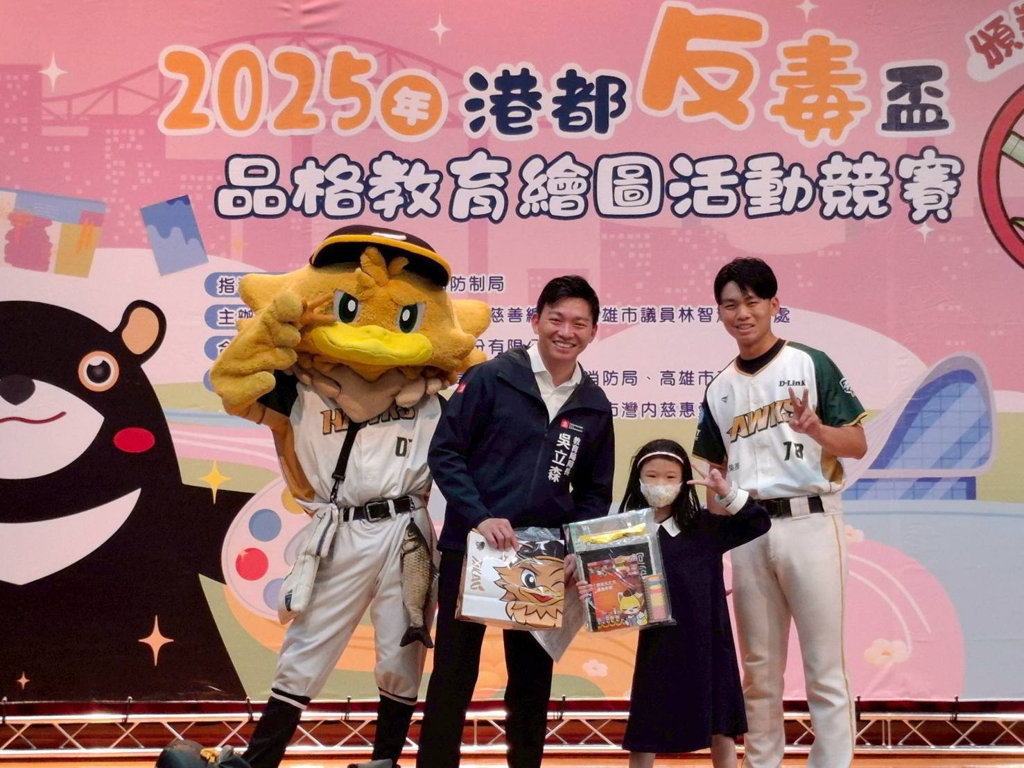 高雄市政府毒品防制局與高雄市社福慈善總會共同舉辦「2025港都反毒盃品格教育繪圖競賽」,並於暑假期間辦理「反毒小畫家宣誓活動」藉由過去得獎者分享畫作理念與參賽感觸,廣邀全市國小學生踴躍投稿,截稿後共收到3,989件作品,並請專業評審委員選出特優、優等及佳作等優秀作品,今(23)日於鳳山行政中心大禮堂舉行頒獎典禮,超過 300 位親子參與,活動安排反毒宣導、有獎徵答,並邀請到台鋼雄鷹吉祥物TAKAO及選手陳世嘉現場蒞臨,氣氛熱鬧溫馨。周邊也精心安排保齡球、套圈圈等反毒闖關遊戲,讓孩子在遊戲中自然學習毒品防制知識。社福慈善總會李昭揚理事長、教育局吳立森局長、林智鴻議員、邱議瑩、許智傑及林岱樺立委團隊均到場支持。