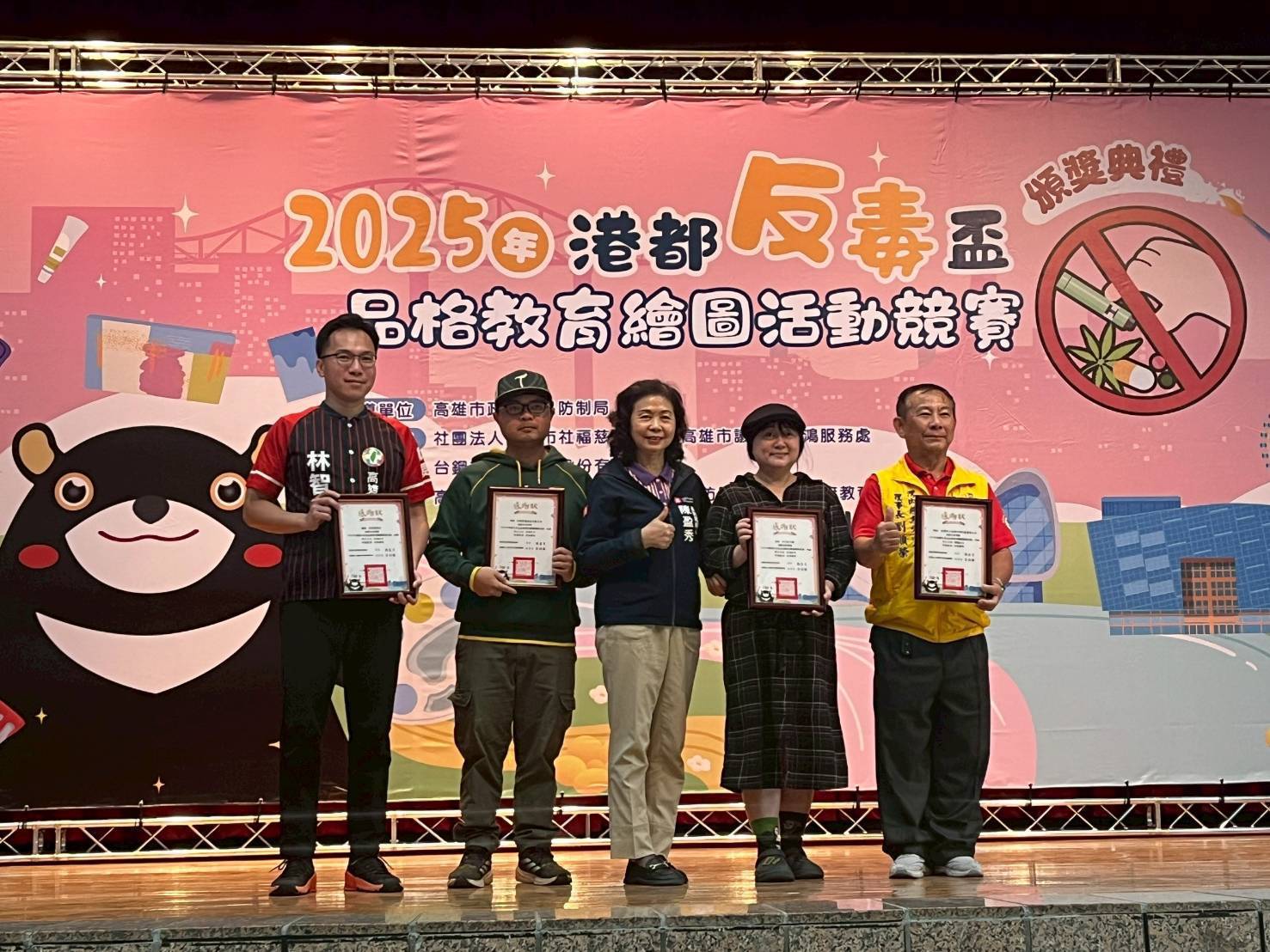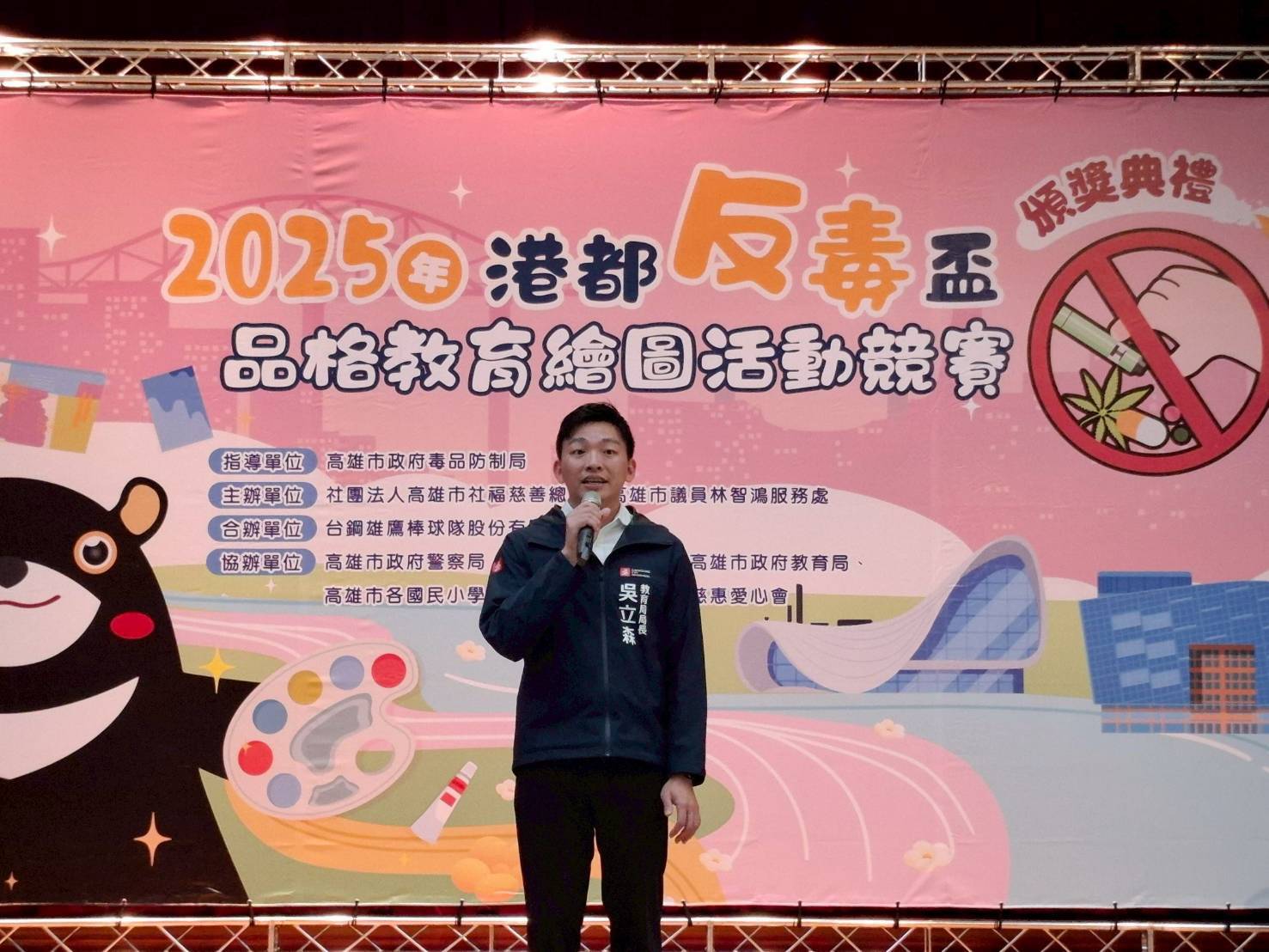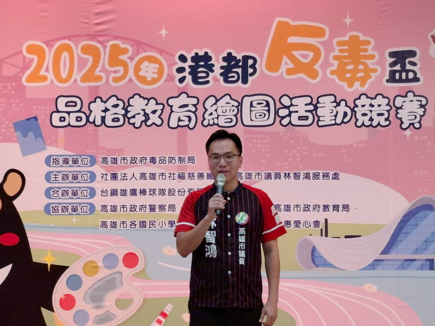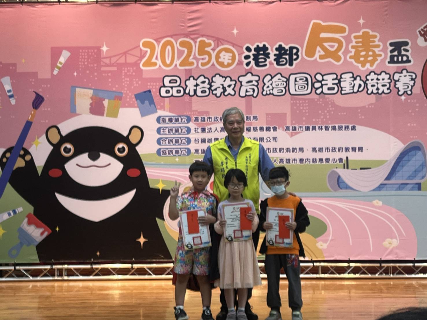 高雄市政府毒品防制局與高雄市社福慈善總會共同舉辦「2025港都反毒盃品格教育繪圖競賽」,並於暑假期間辦理「反毒小畫家宣誓活動」藉由過去得獎者分享畫作理念與參賽感觸,廣邀全市國小學生踴躍投稿,截稿後共收到3,989件作品,並請專業評審委員選出特優、優等及佳作等優秀作品,今(23)日於鳳山行政中心大禮堂舉行頒獎典禮,超過 300 位親子參與,活動安排反毒宣導、有獎徵答,並邀請到台鋼雄鷹吉祥物TAKAO及選手陳世嘉現場蒞臨,氣氛熱鬧溫馨。周邊也精心安排保齡球、套圈圈等反毒闖關遊戲,讓孩子在遊戲中自然學習毒品防制知識。社福慈善總會李昭揚理事長、教育局吳立森局長、林智鴻議員、邱議瑩、許智傑及林岱樺立委團隊均到場支持。